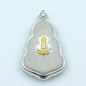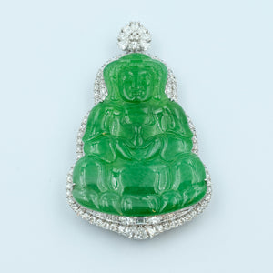 This serene GuanYin Pendant features a beautiful green Grade A jadeite, set in 18K white gold. The GuanYin design, symbolizing compassion and tranquility, adds a touch of grace and protection, making it a timeless and meaningful piece for any jewelry collection.