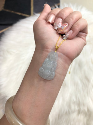 This exquisite GuanYin Pendant features a white translucent Grade A Burmese jadeite, set in 18K yellow gold. With dimensions of 33.6x19.7x4mm, the GuanYin design, symbolizing compassion and protection, adds a graceful and meaningful touch to any jewelry collection.