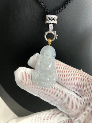 GuanYin White Translucent Pendant 18K Yellow Gold Inlay Natural Burmese Jadeite Grade A