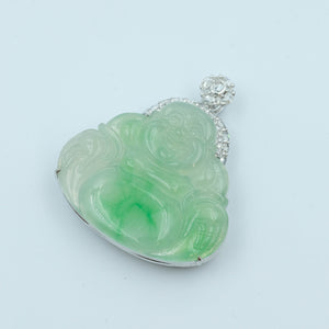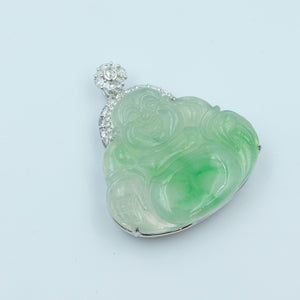 This charming Laughing Buddha pendant features Grade A jadeite in a pastel green translucent "moss on snow" design. Set in 18k white gold with natural diamond inlay, it symbolizes joy and prosperity with timeless elegance.