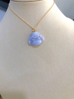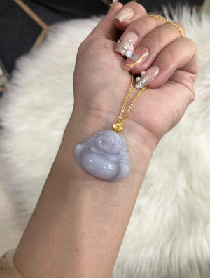 This joyful Laughing Buddha Pendant features purple Grade A Burmese jadeite, set in 18K yellow gold. With dimensions of 24.1x28.7x9.8mm, the Laughing Buddha symbolizes joy, happiness, and good fortune, making it a meaningful and vibrant addition to any jewelry collection.