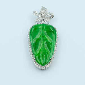 This beautiful leaf pendant features Grade A imperial green jadeite jade, symbolizing nature and prosperity. Set in 18k white gold, it offers a perfect balance of elegance and natural beauty, making it an ideal addition to any jewelry collection.