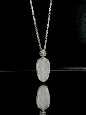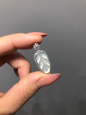 This elegant Leaf Pendant features white transparent natural Burmese Jadeite, Grade A, accented with a natural diamond and inlaid in 18K white gold. With dimensions of 27.4x11.4x5.3mm, it symbolizes purity and elegance, making it a meaningful and refined addition to any jewelry collection.