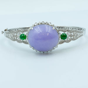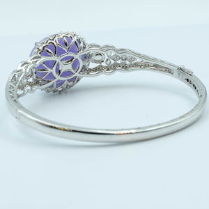 This exquisite oval-shaped jadeite bangle features a serene lavender green hue, set in 18k white gold with natural diamond inlay. Its elegant design combines luxury and refinement, making it a stunning addition to any collection.