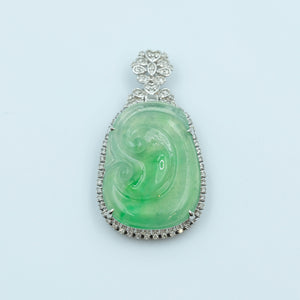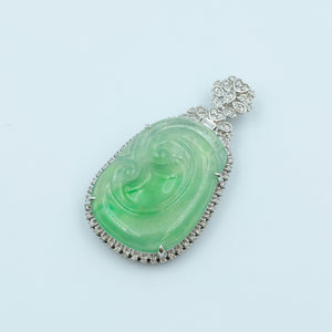 This exquisite RuYi Pendant features a translucent apple green Grade A jadeite, set in 18K white gold. The RuYi design, symbolizing good fortune, power, and prosperity, adds a meaningful and elegant touch to any jewelry collection.