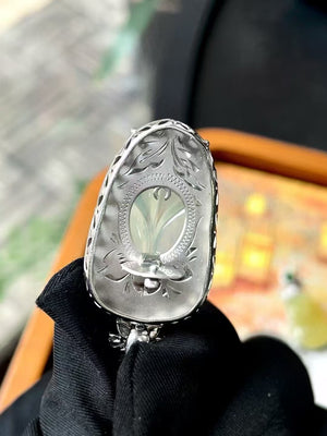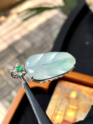 Delicately carved and beautifully translucent, this Leaf Pendant features the enchanting Moss in Snow jadeite pattern — a harmonious blend of soft white and mossy green hues. Symbolizing growth, renewal, and natural elegance, the leaf design is perfectly complemented by a refined 18K white gold setting and a sparkling diamond accent, creating a timeless statement piece.