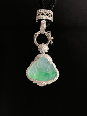 Translucent Mint Green Laughing Buddha Pendant – 18K White Gold with Diamond