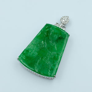 This unique WuShiPai Pendant features a beautifully crafted green landscape design on Grade A jadeite, set in 18K white gold. The intricate landscape carving symbolizes tranquility and natural beauty, making it a distinctive and meaningful addition to any jewelry collection.